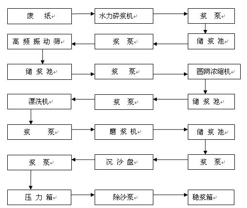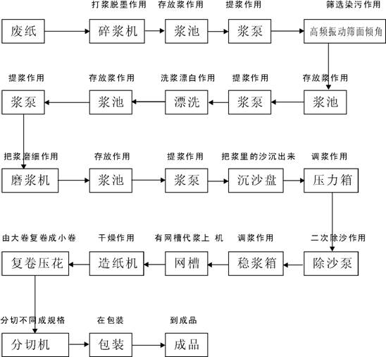 由廢紙進(jìn)入水力碎漿機(jī),水力碎漿機(jī)對廢紙進(jìn)行作打漿脫墨,打漿脫墨后的紙漿流入漿池;由提漿泵把紙漿從漿池提入高頻振動篩,高頻振動篩起到篩選雜物分離作用;篩選后到流入漿池,再由漿泵提入漂洗機(jī),作用是洗漿干凈,漂白;漂白后自動流入漿池;再由漿提入磨漿機(jī),經(jīng)磨漿磨成細(xì)漿后,自動流入漿池再由漿泵提入沉沙盤,沉沙盤的作用是將沙灰等雜質(zhì)沉淀分離出去,后制成純漿,再由除沙泵提入穩(wěn)漿箱,穩(wěn)漿箱作用是調(diào)和漿的濃度,之后自動流入網(wǎng)槽后,由網(wǎng)籠毛毯帶漿進(jìn)入烘缸。(烘缸是起烘干作用)后進(jìn)入成品卷紙。卷紙后進(jìn)入復(fù)卷機(jī),復(fù)卷的作用是起復(fù)卷打孔壓花作用。由大卷復(fù)卷成小卷,后進(jìn)入分切機(jī),分切機(jī)的作用是起分切,不同規(guī)格長短作用,后經(jīng)包裝到成品。注:鍋爐是起到熱氣的作用,送入烘缸起到干燥紙的作用。
